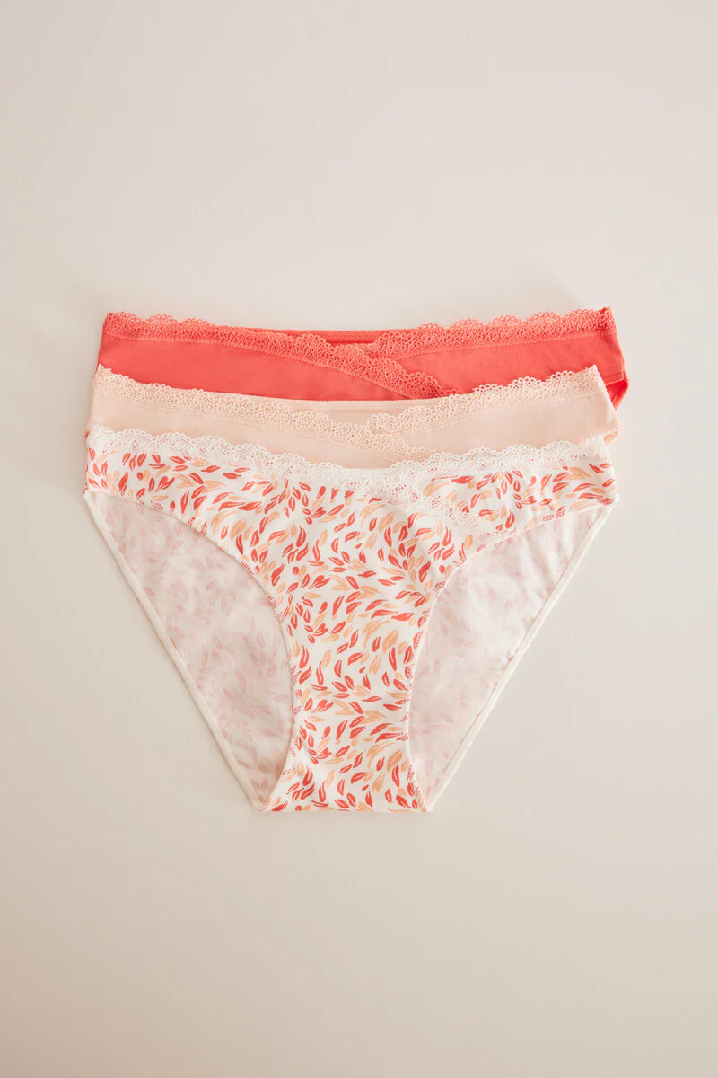 Pack of three pairs of wide-side Brazilian panties with lace details. An absolute must-have for your underwear drawer.