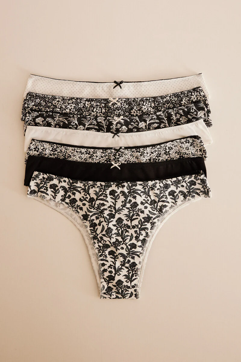 Pack of seven pairs of cotton Brazilian panties in black and white with different prints. They also have a little bow and gathered detail on the front to add an extra original touch. Just ideal, right?
