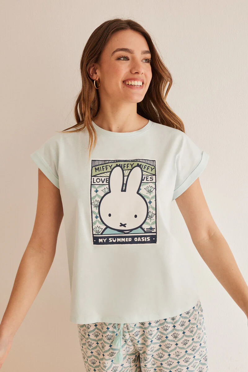 Printed 100% cotton pyjamas with short-sleeved top and Capri bottoms, in lovely shades of green. Super comfy and ideal for bedtime or lounging at home in style.