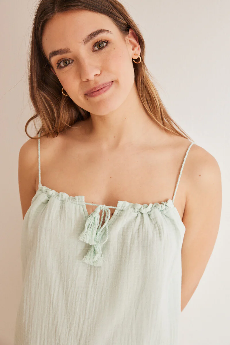 Nightgown with straps, in 100% cotton cheesecloth in a lovely green colour. Super comfy and ideal for bedtime or lounging at home in style.